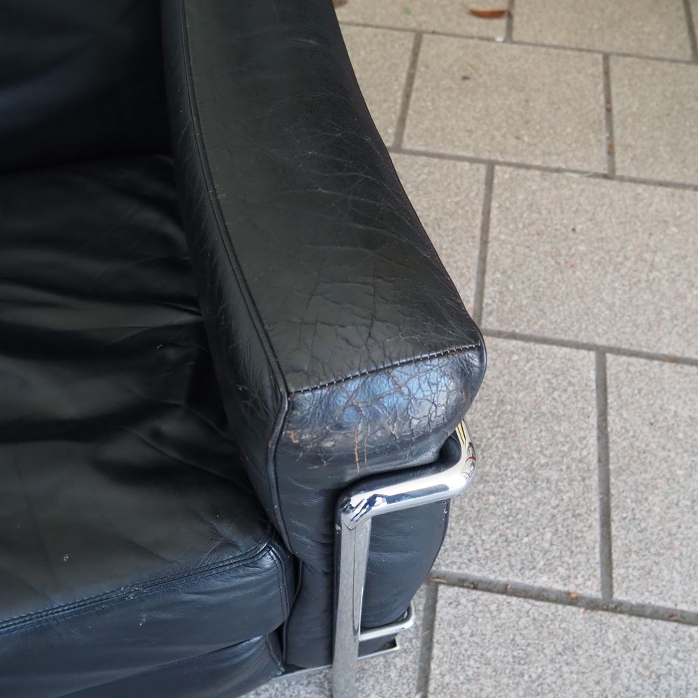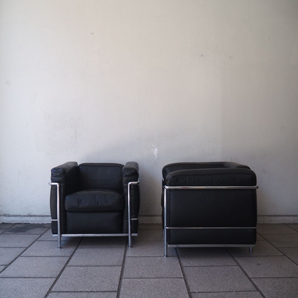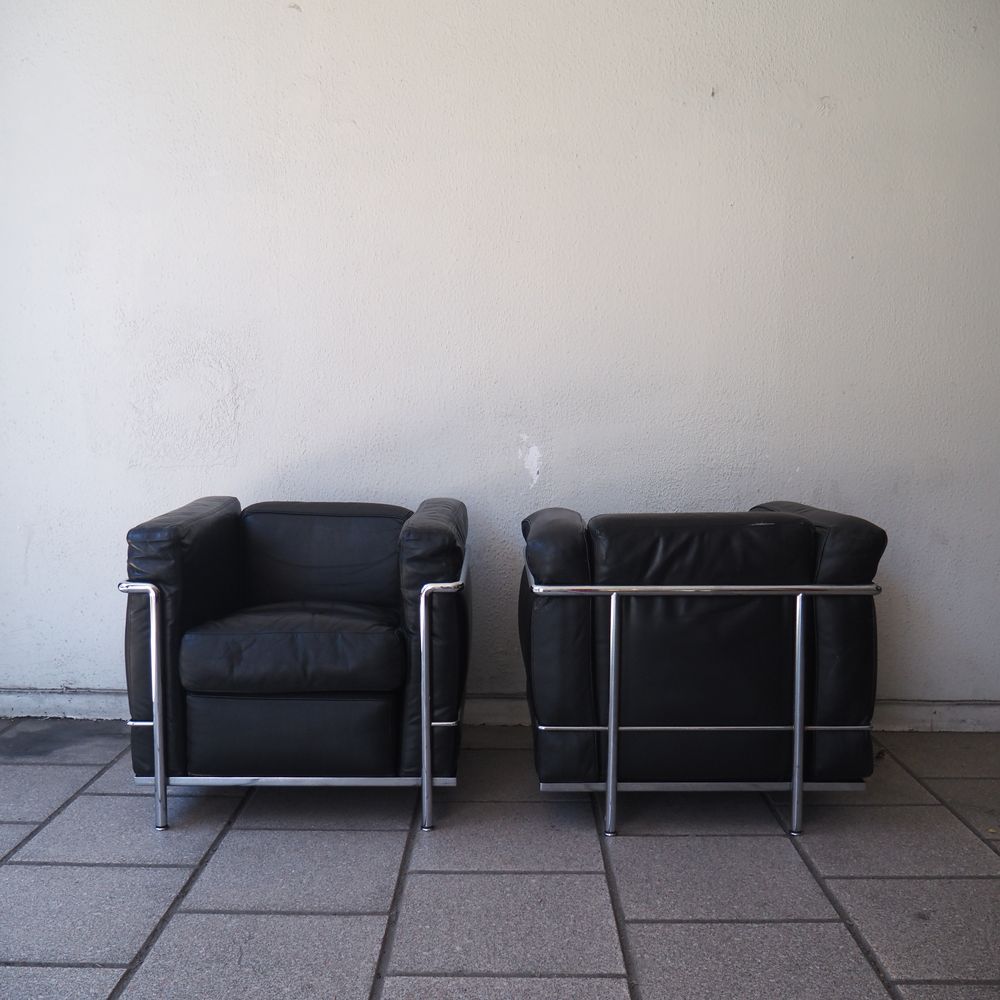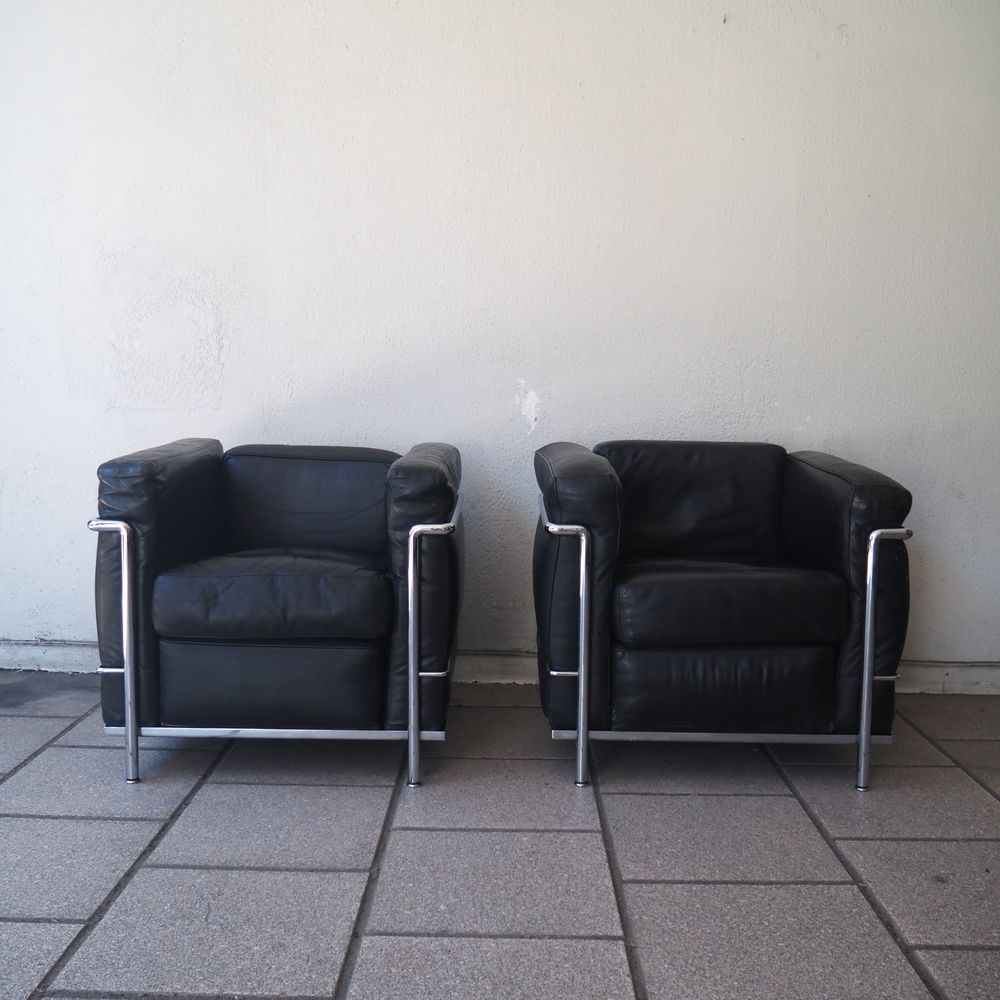 Le Corbusier, Charlotte Periand, Pierre Jeanneret / Cassina : Paire de fauteuils, modèle « LC2 », dessiné en 1928, structure tubulaire en acier cintré et chromé, assises, dossiers et joues avec coussins amovibles rembourré de mousse et recouverts de cuir noir, numéroté avec sticker Cassina, édition vers 1970 (1 accoudoir légèrement crouté et 1 coussin d’assise regarnie)