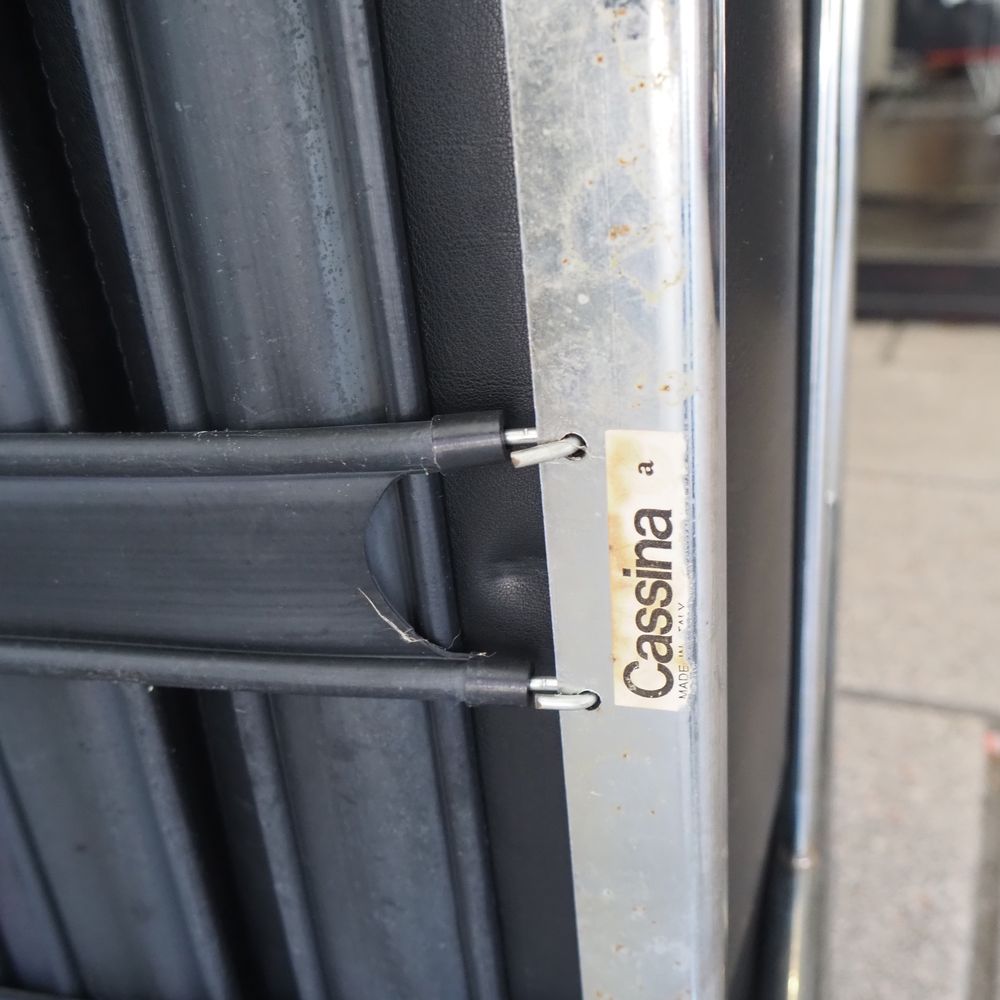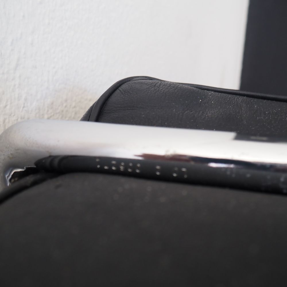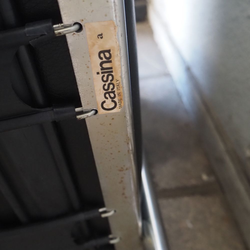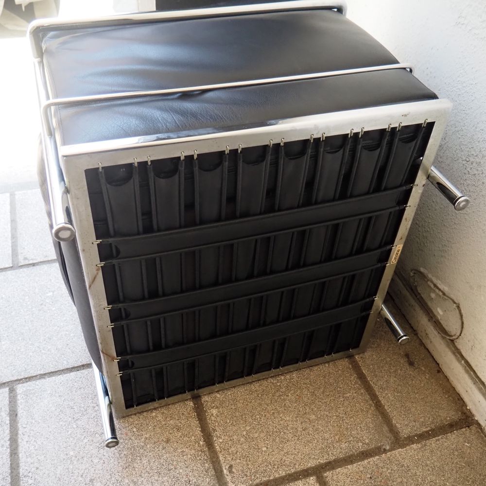 Le Corbusier, Charlotte Periand, Pierre Jeanneret / Cassina : Paire de fauteuils, modèle « LC2 », dessiné en 1928, structure tubulaire en acier cintré et chromé, assises, dossiers et joues avec coussins amovibles rembourré de mousse et recouverts de cuir noir, numéroté avec sticker Cassina, édition vers 1970 (1 accoudoir légèrement crouté et 1 coussin d’assise regarnie)
