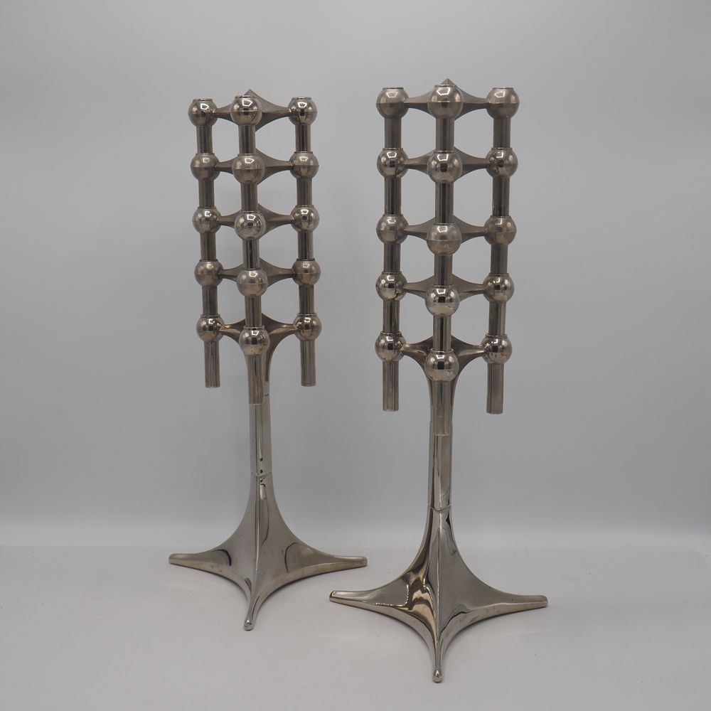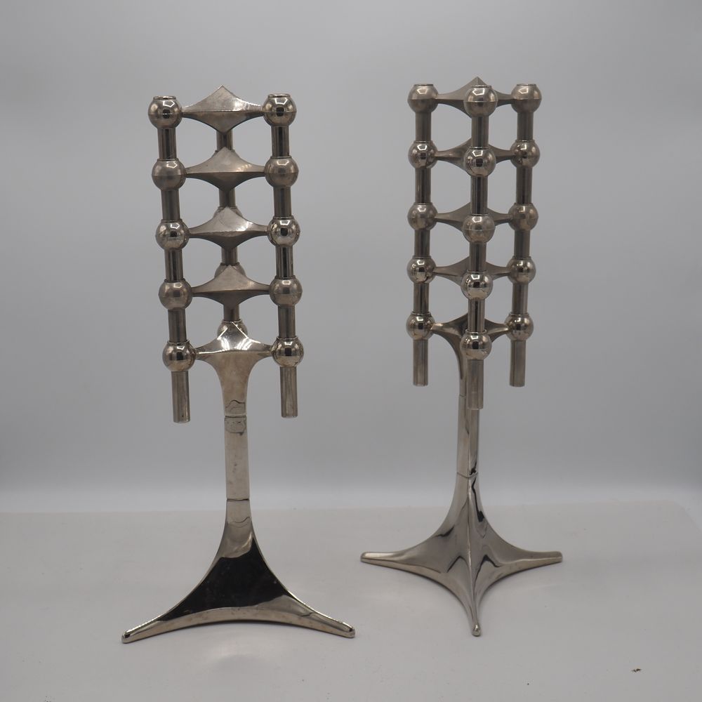 Werner Stoff / Hans Nagel : Paire de bougeoirs sur pieds tripode vers 1970 + 8 éléments modulables empilables, modèle S22, duralumin nickelé