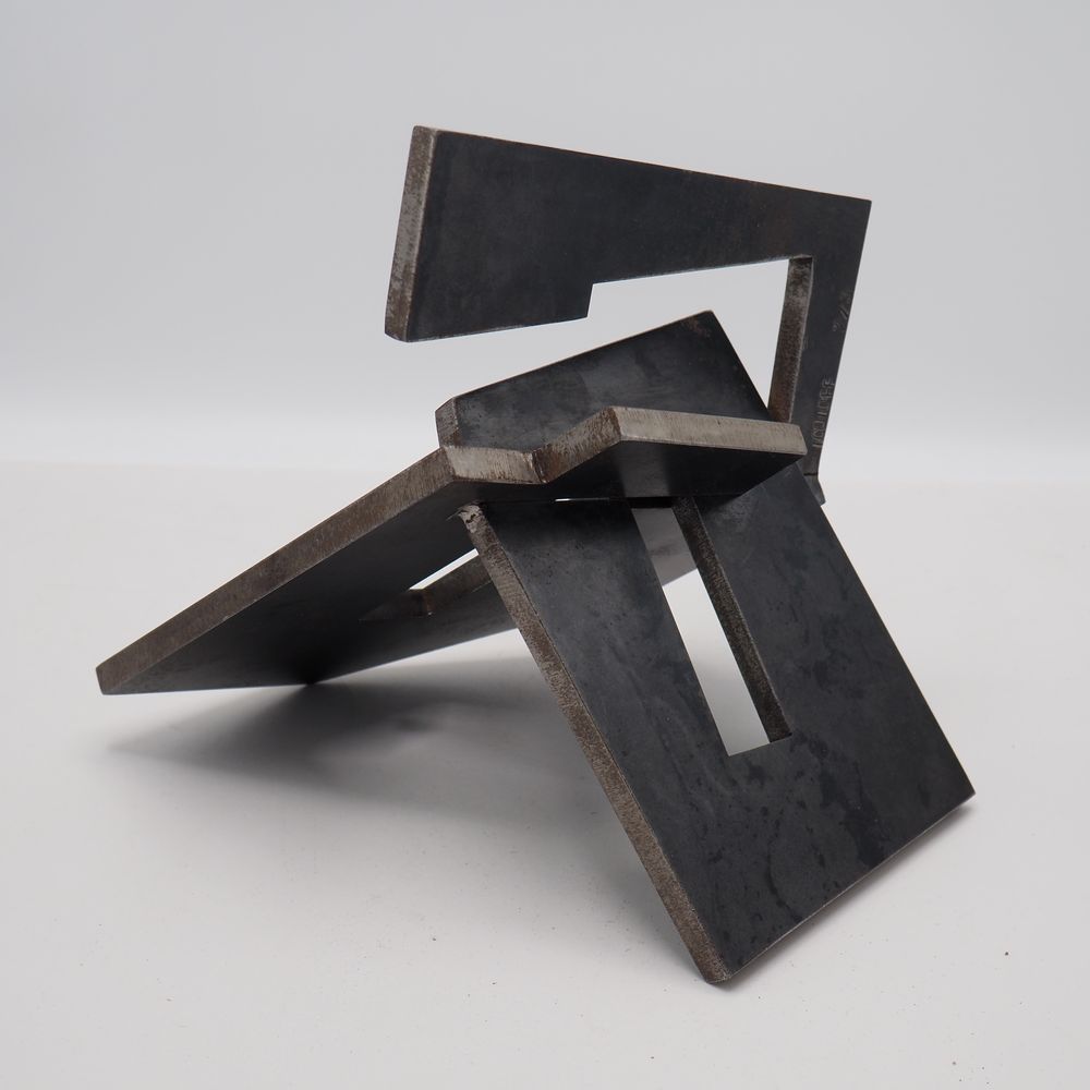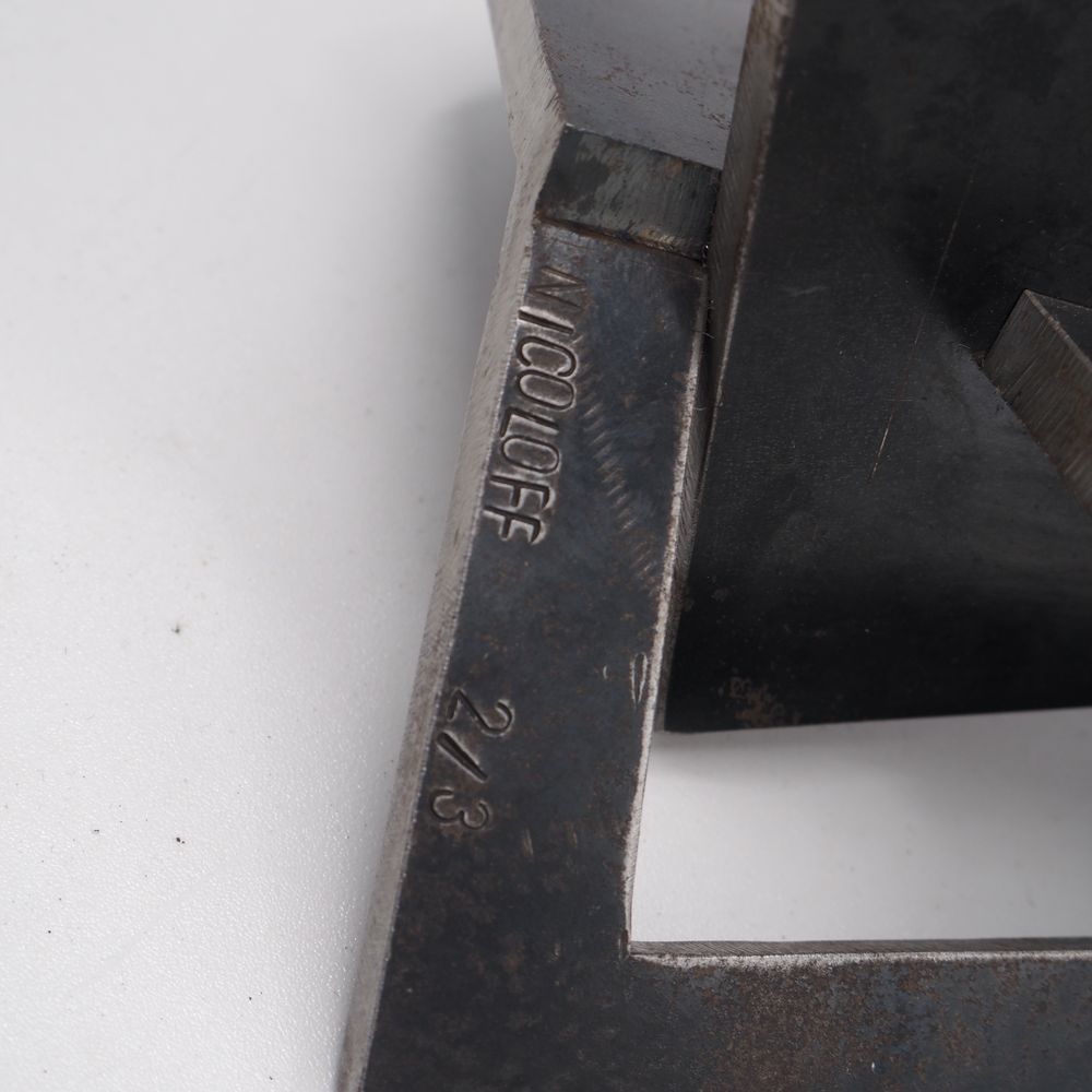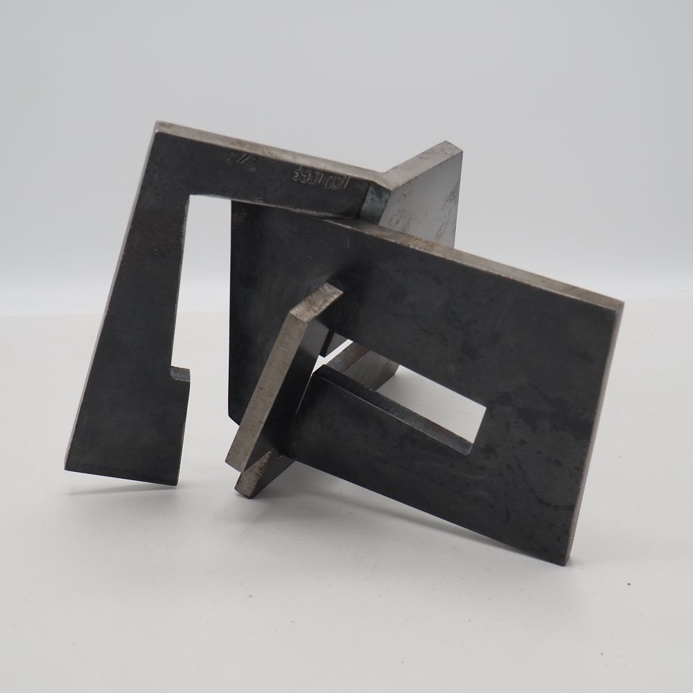 Nicoloff : Sculpture brutaliste à miltiple positions, constituée de 3 épaisses tranches en acier découpées et ajourées, signée à la base et numérottée 2/3, dim : H: 18,5, L22,5 l: 22,50cm