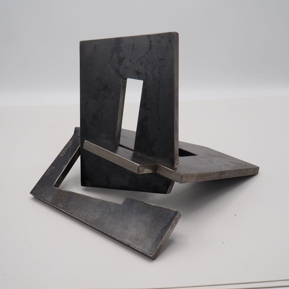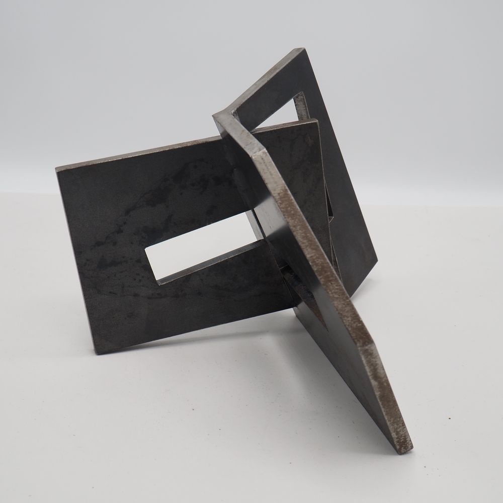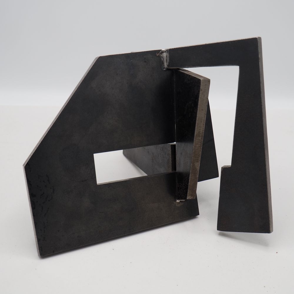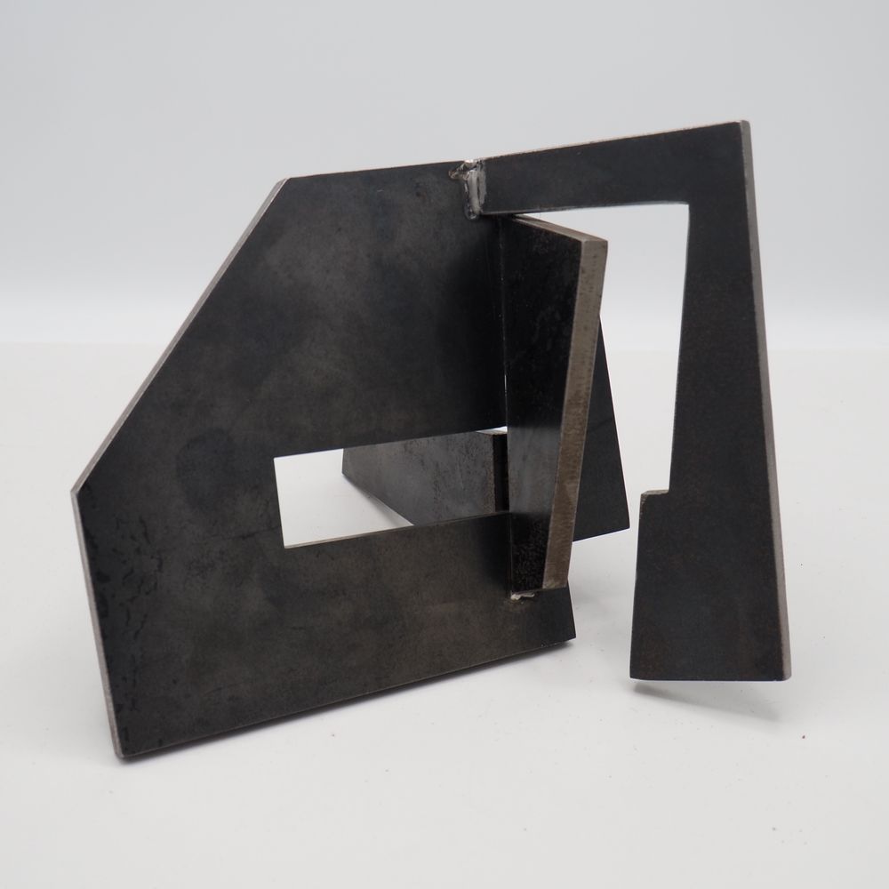 Nicoloff : Sculpture brutaliste à miltiple positions, constituée de 3 épaisses tranches en acier découpées et ajourées, signée à la base et numérottée 2/3, dim : H: 18,5, L22,5 l: 22,50cm