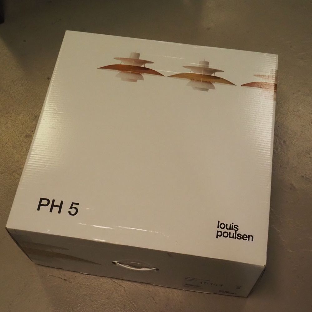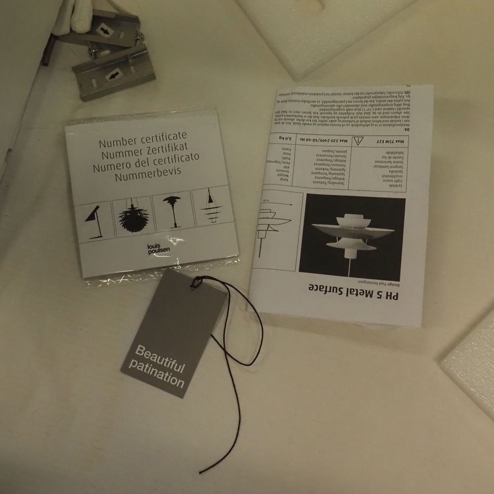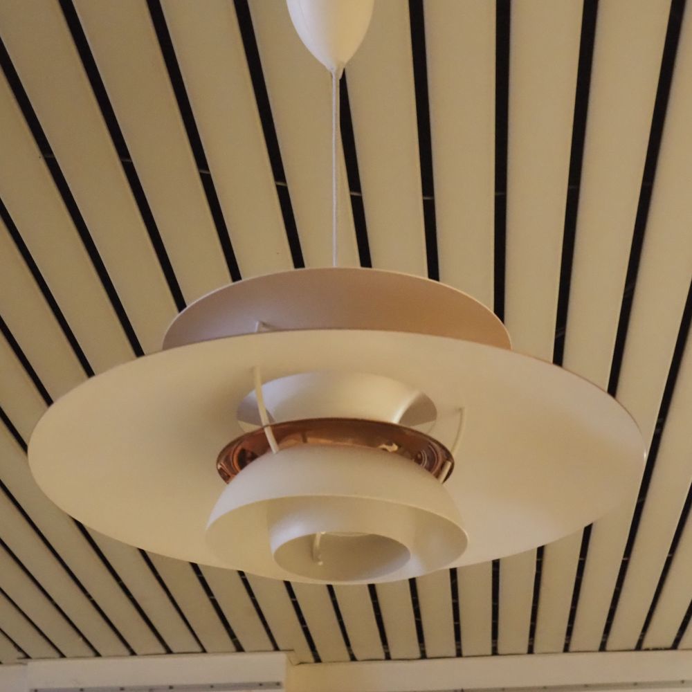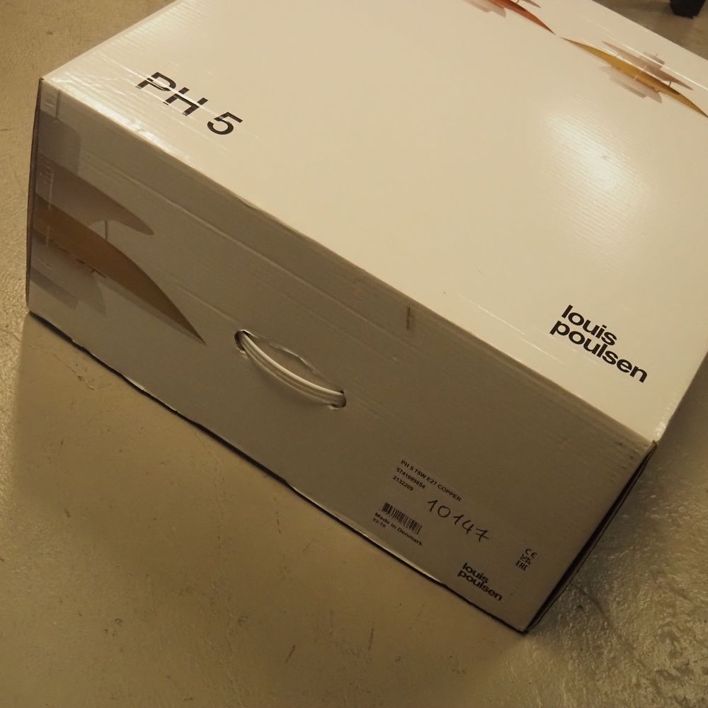 Poul Henningsen 1894 – 1967 / Louis Poulsen : Suspension vers 1960, modèle PH5, feuille d’aluminium laqué blanc et laiton doré, édition contemporaine, avec boite d’origine, état d’origine proche du neuf, diam: 50 cm