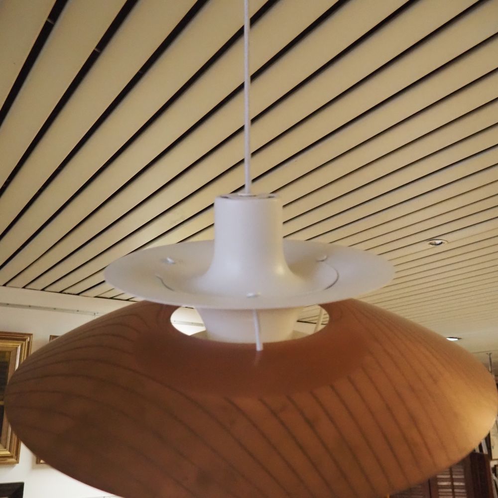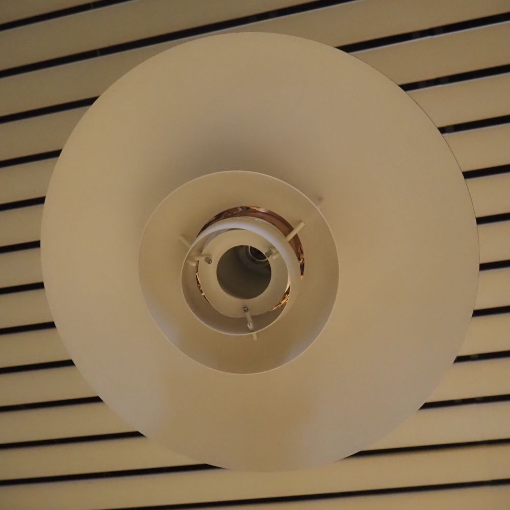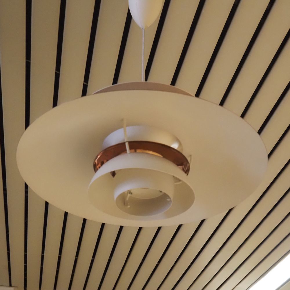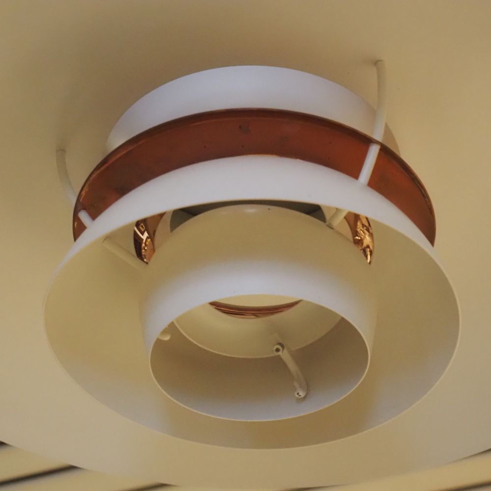 Poul Henningsen 1894 – 1967 / Louis Poulsen : Suspension vers 1960, modèle PH5, feuille d’aluminium laqué blanc et laiton doré, édition contemporaine, avec boite d’origine, état d’origine proche du neuf, diam: 50 cm