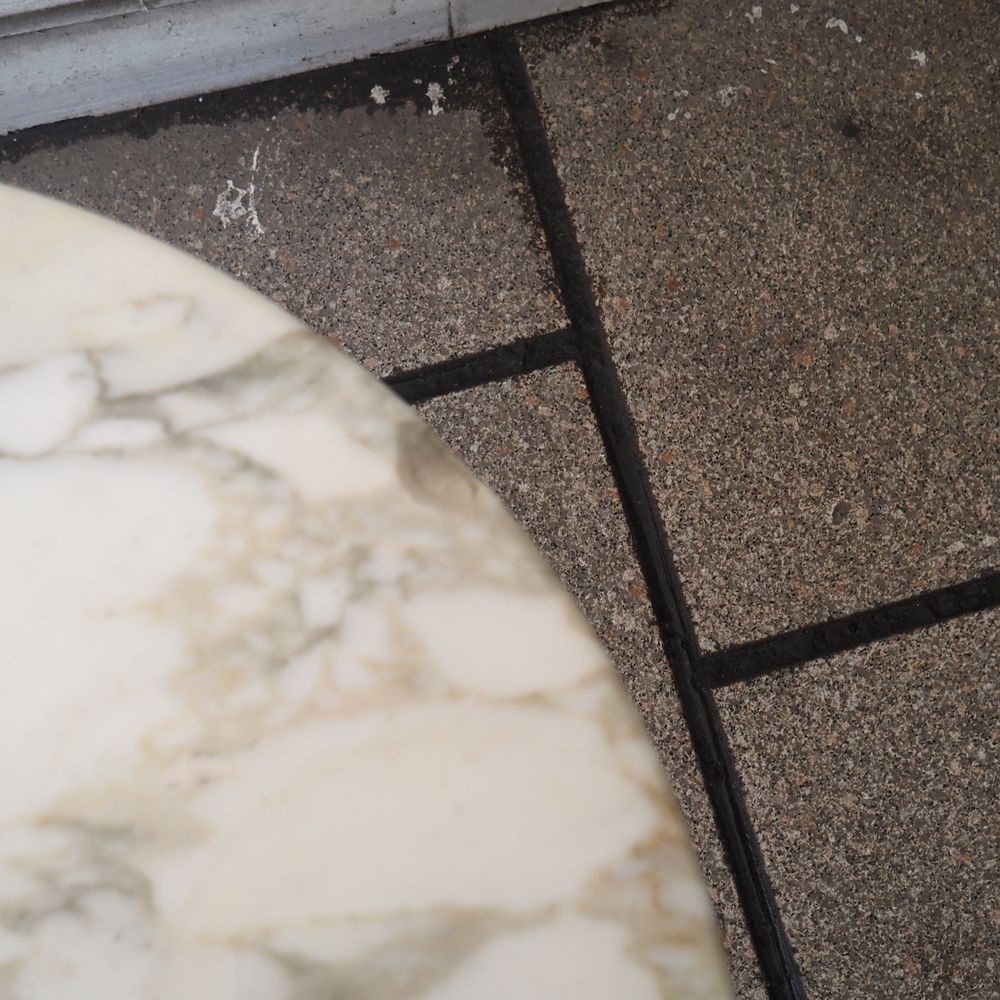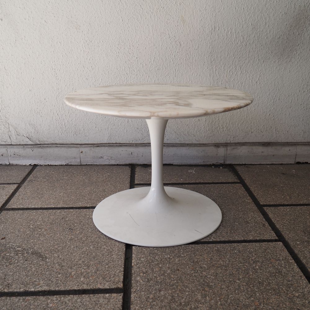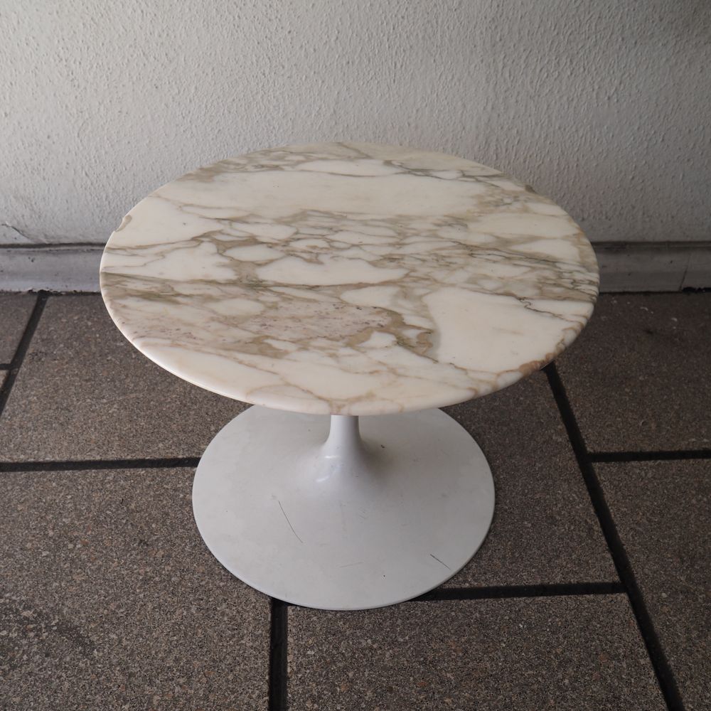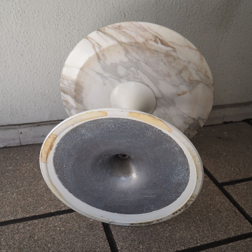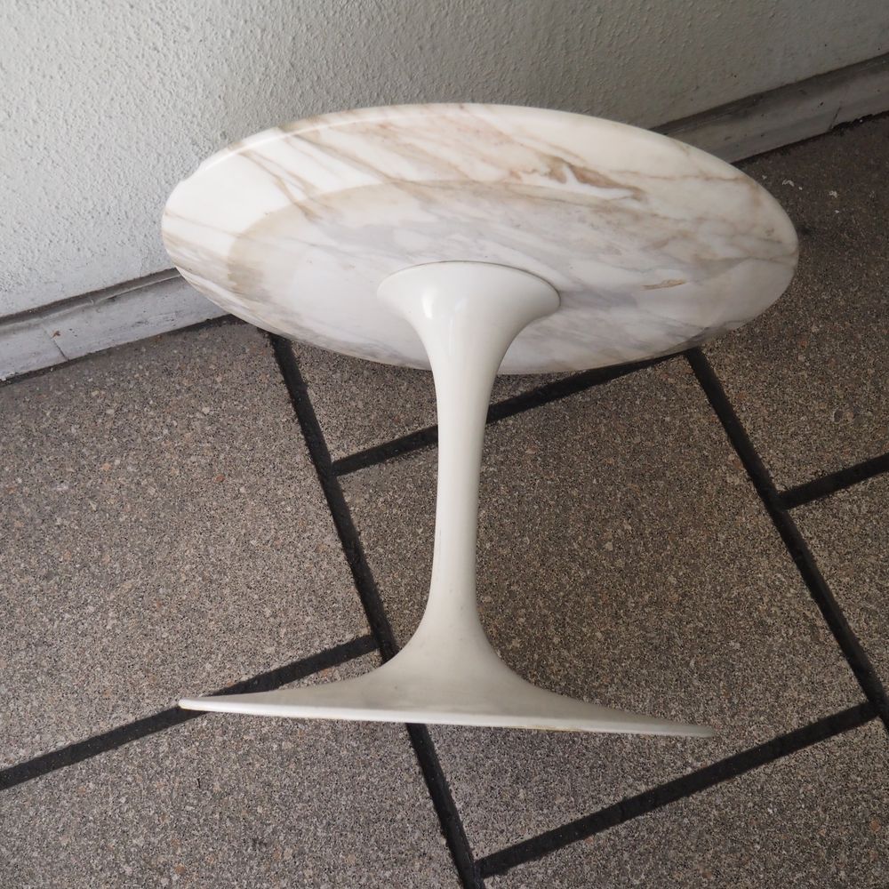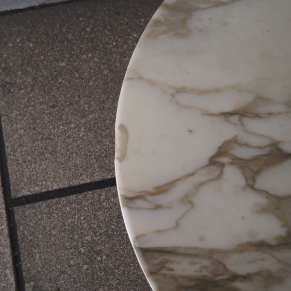 Eero Saarinen (1910-1961) / Knoll International : Guéridon, modèle tulipe, dessiné en 1956, plateau circulaire en marbre de carrare blanc veiné gris, posé sur un pied tulipe en aluminium époxy blanc, édition vers 1956, (2 éclats coté), diam: 37, H: 51 cm