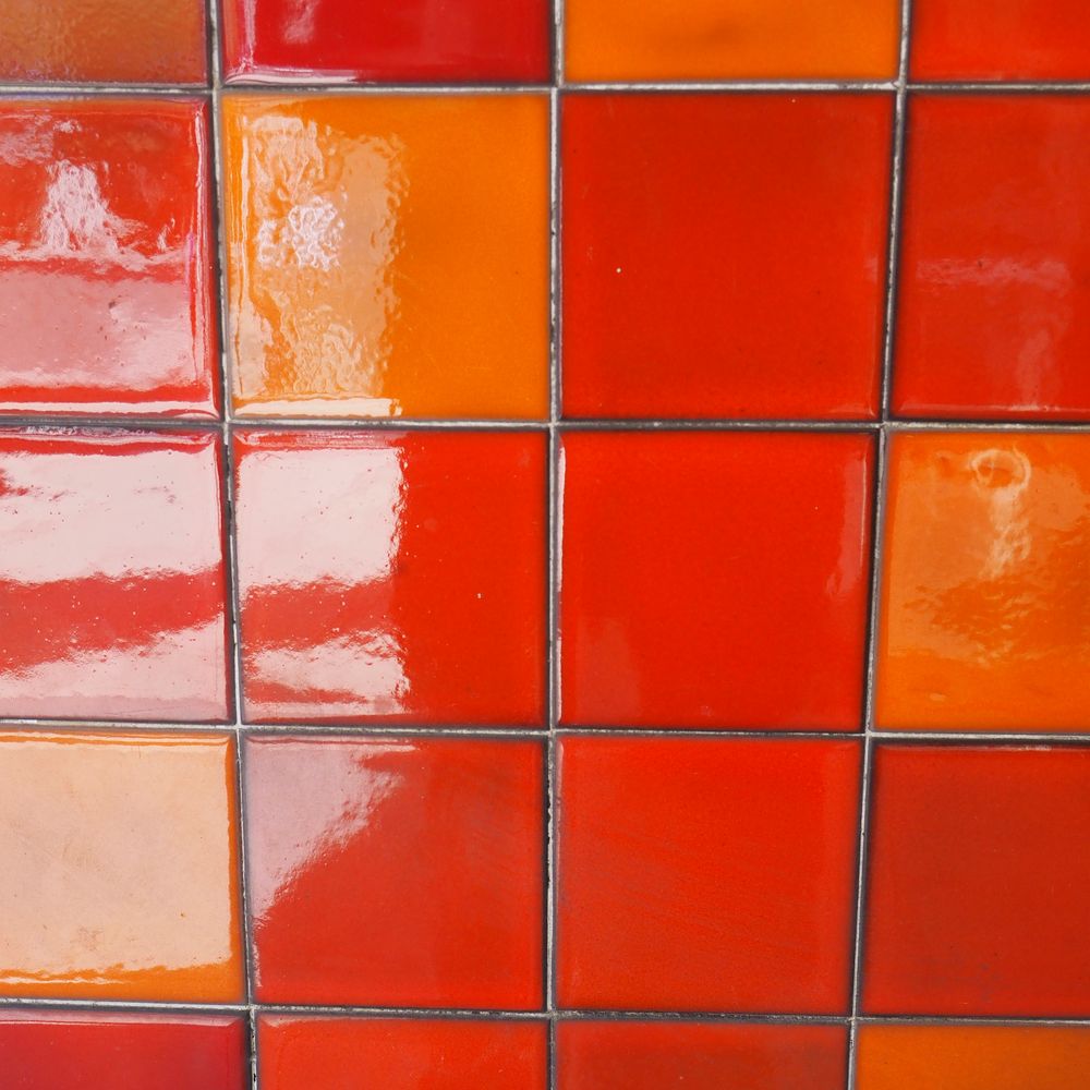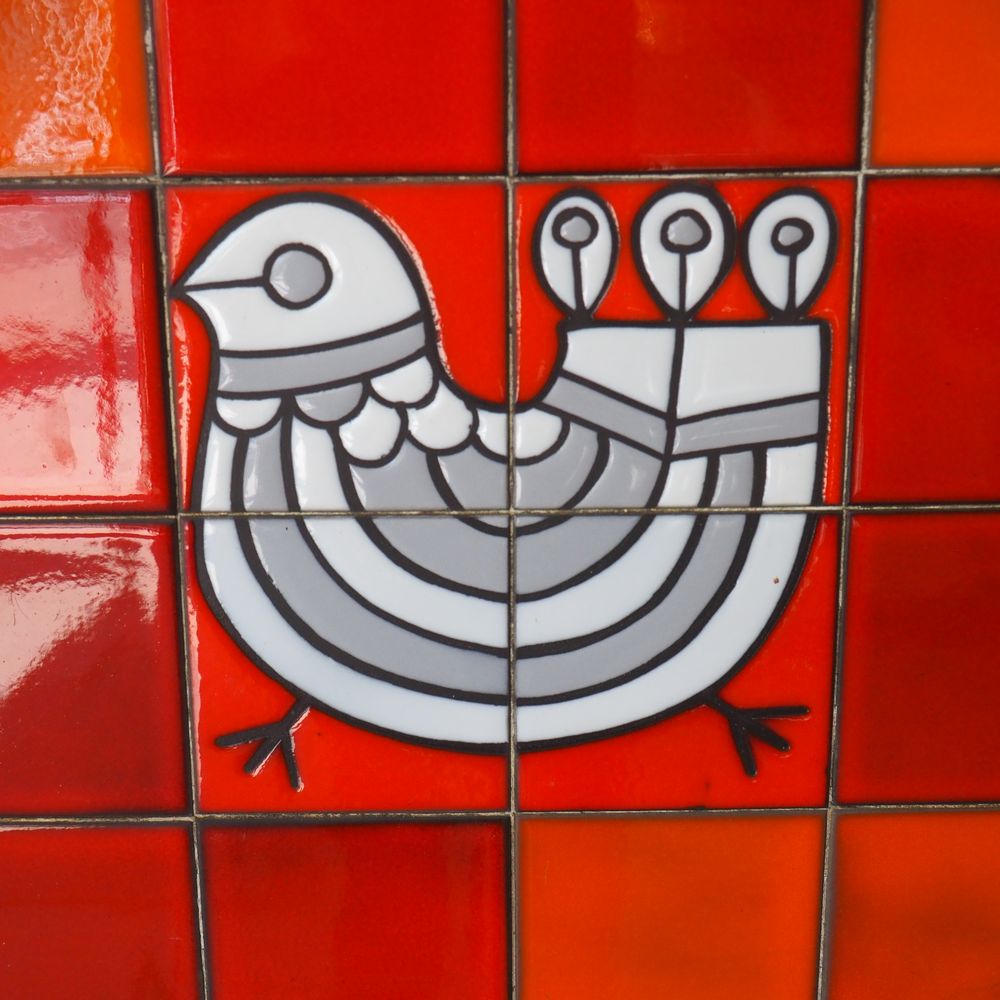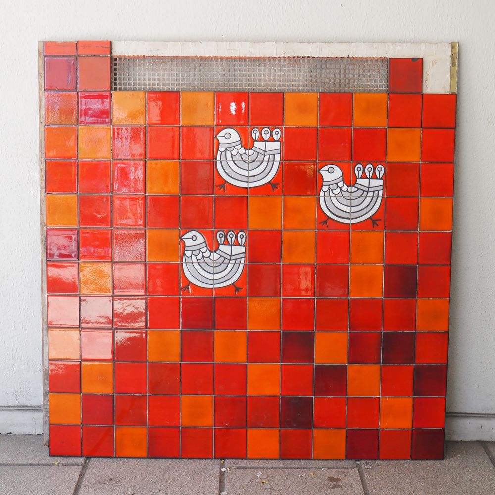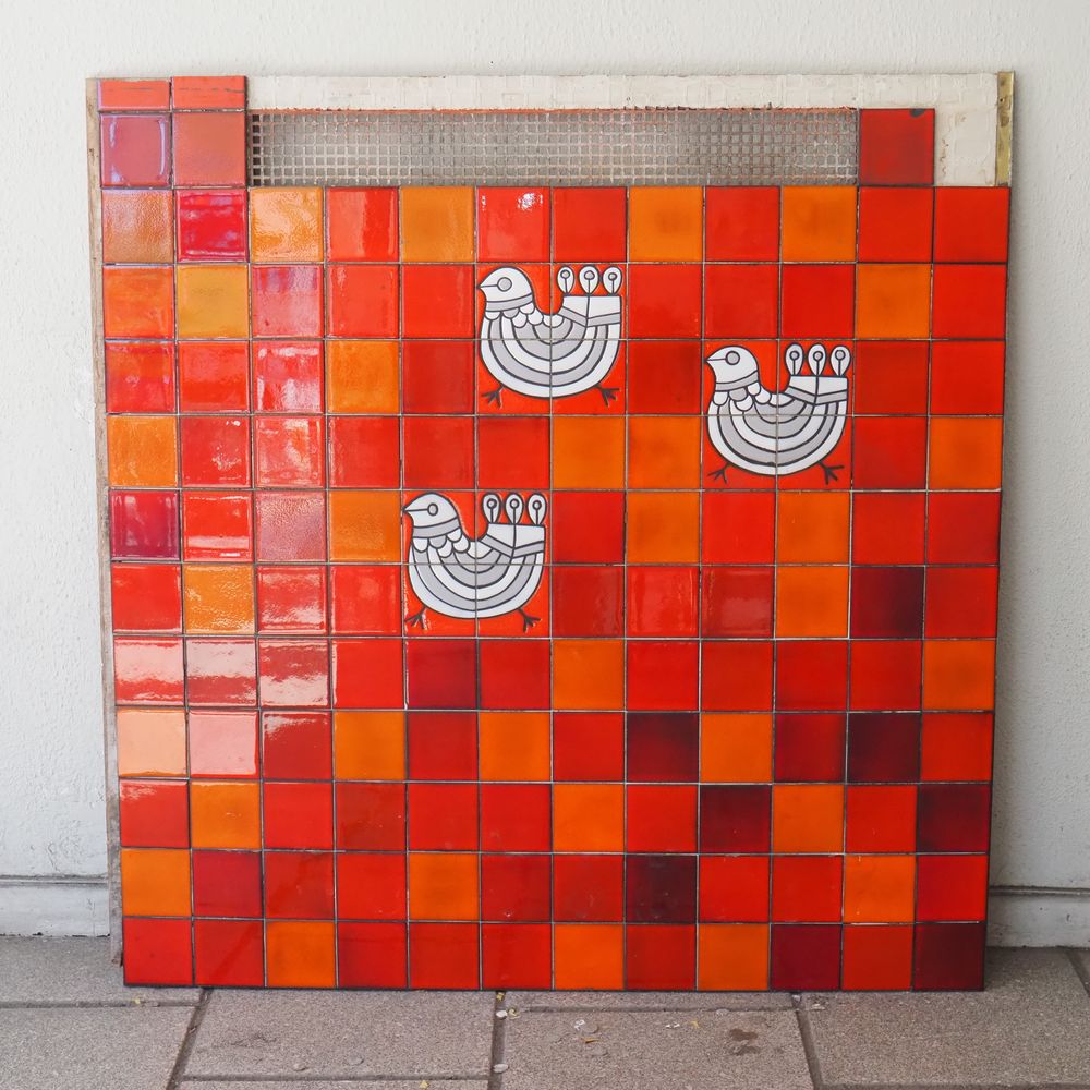 Roger Capron : Panneau vers 1960, provenance d’une épicerie, composé de 133 carreaux en céramique émaillée rouge, décor avec 3 poules, dim: 120 x 120 cm, dim carreau : 9,8 x 9,8 cm