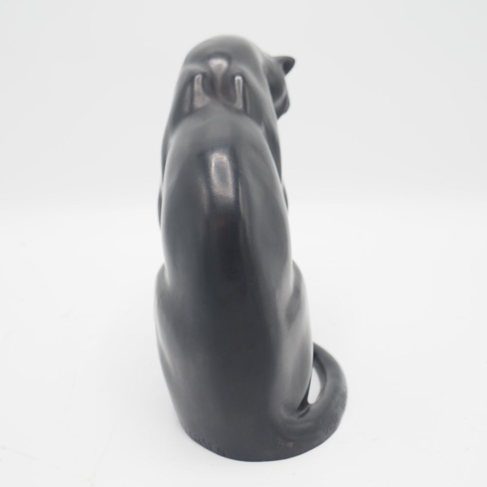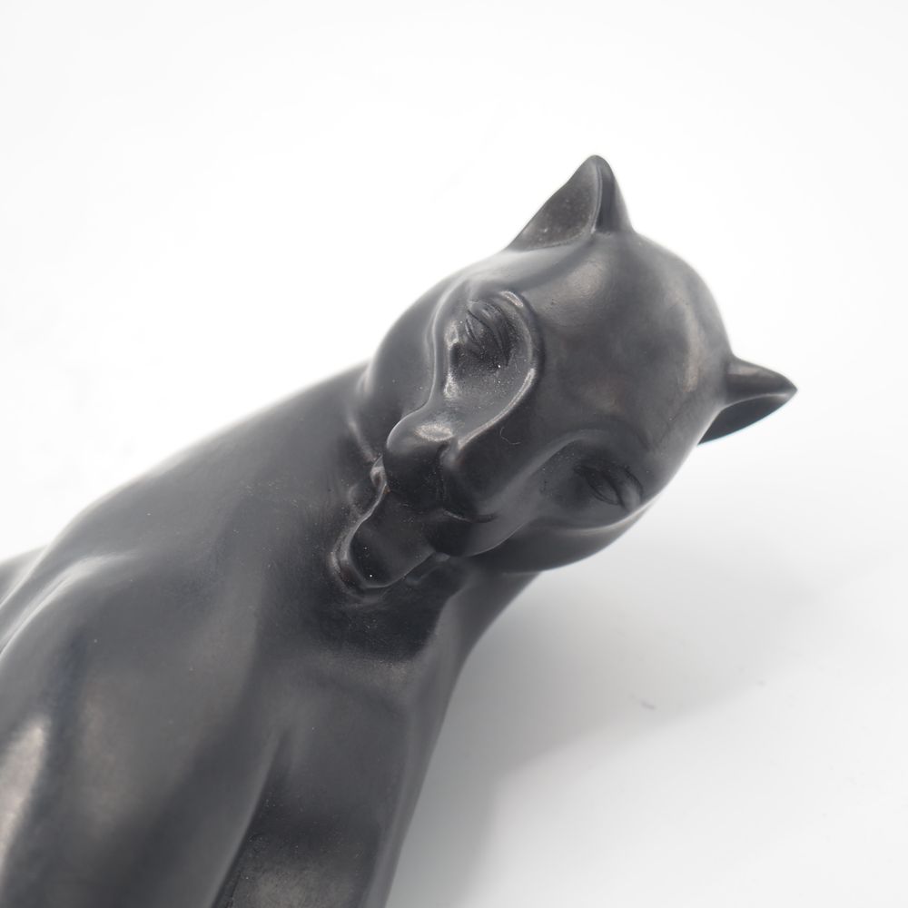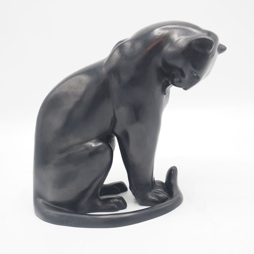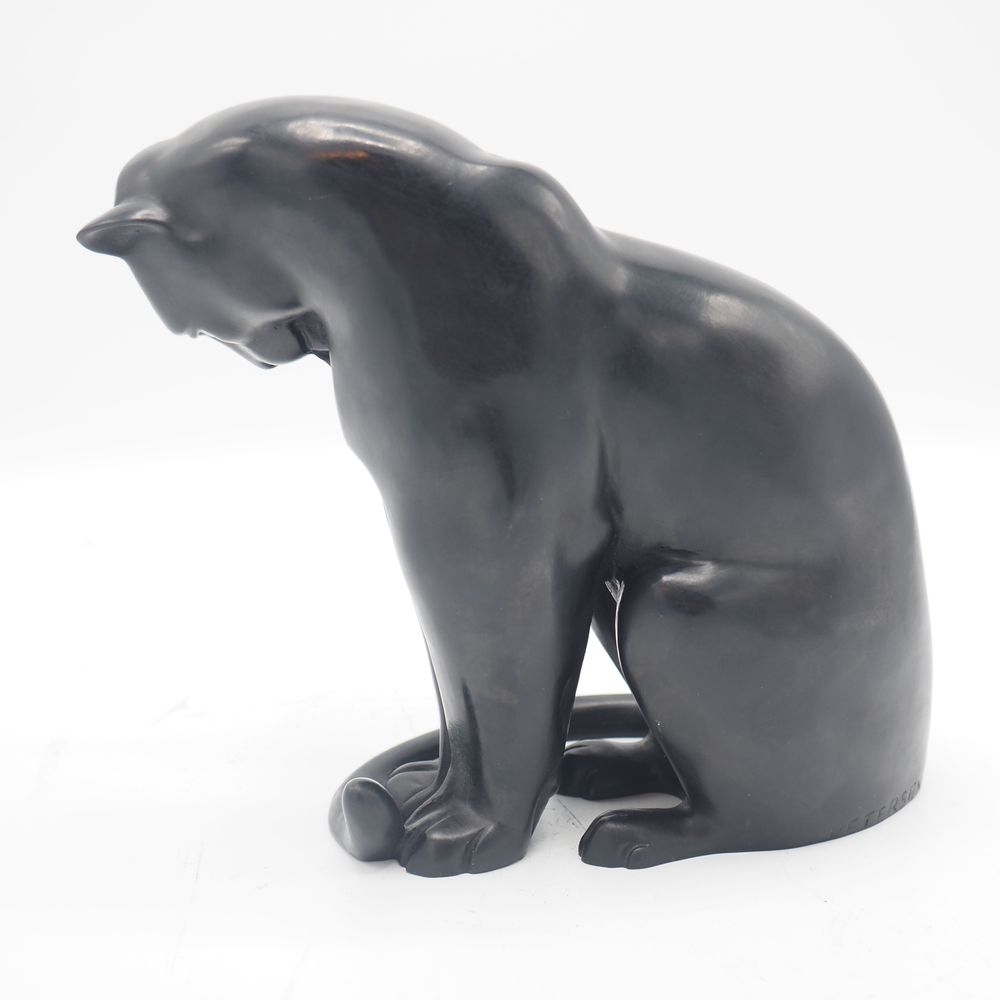 Armand Petersen 1891-1969 / La fonderie Susse Frs Edts Paris : Sculpture, panthère faisant sa toilette, bronze à patine noire signé à la base avec nom de la fonderie, H : 17, L : 19, l: 8,5 cm.