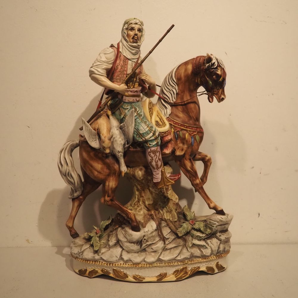 Sculpture vers 1970 : Biscuit polychromé, figurant un chasseur arabe avec fusil en métal doré et son gibier, marqué sous la base Italia, H: 67, L: 46, P: 24 cm