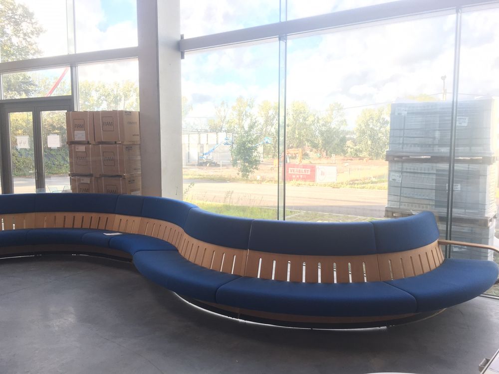 Swinger Maguns Olsen : Important canapé formant « S », composé de 7 éléments démontables dont 2 avec accoudoirs, bois cintré ajouré, assise et dossier en mousse garnis de tissu bleu. L : 6,90 m, Hauteur d’assise 46/86 cm, P : 70 à 160 cm, divisible en 2 parties