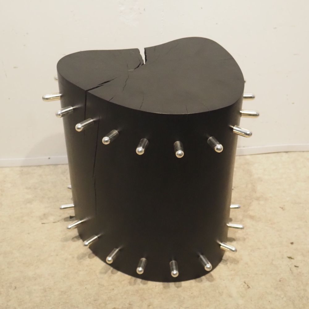 Thomas Duriez (1979) : Pièce unique, table bout de canapé vers 2020, travaillée dans une bile de bois de forme rognon, décor en métal chromé à l’electrolyse, signée à la main sous la base, œuvre présentée à la galerie Armel Soyer, H: 48,5, L: 43, P: 39 cm